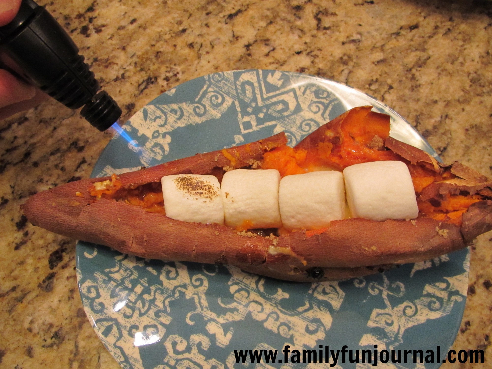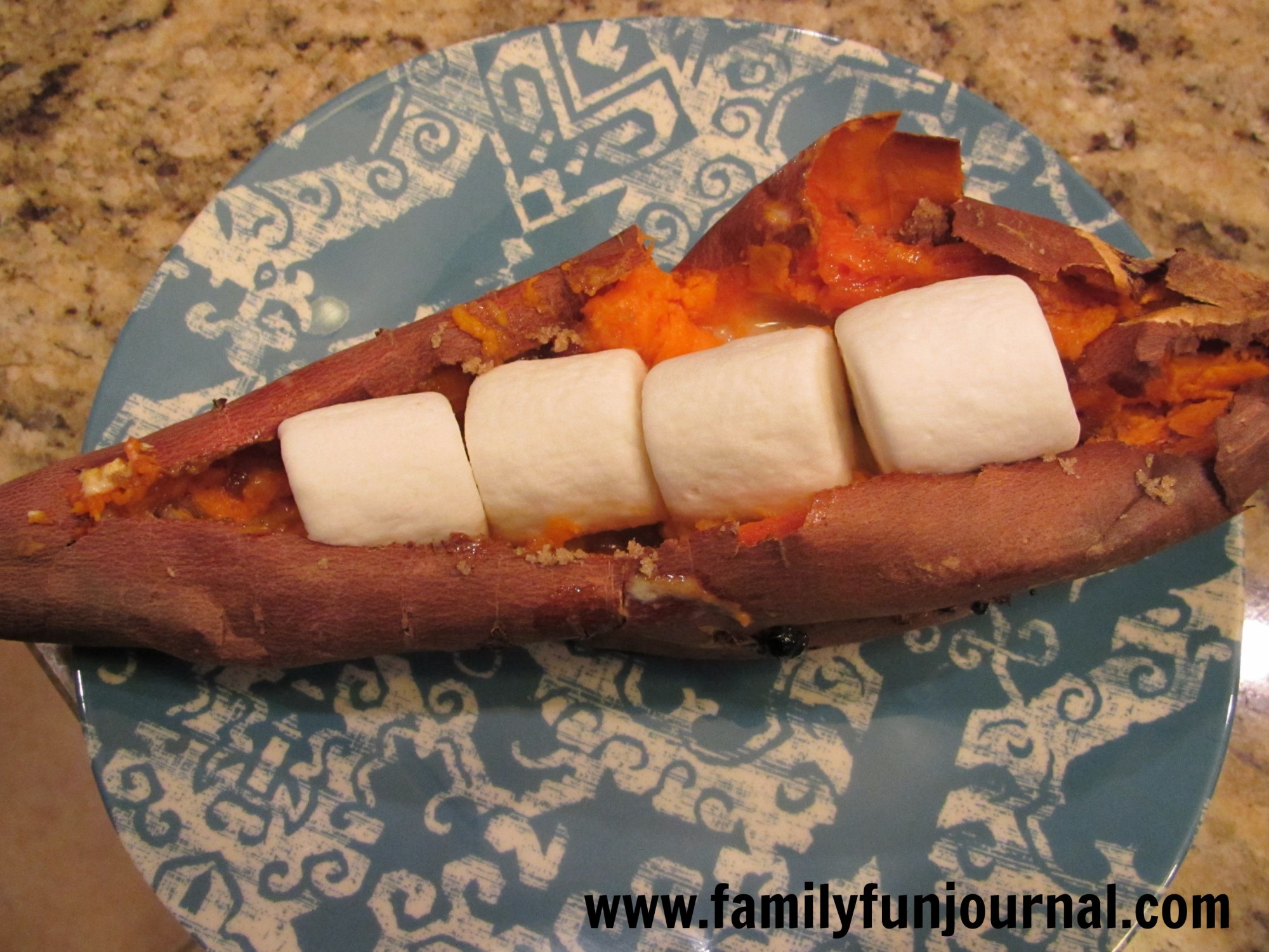 You bake the sweet potatoes and serve them with butter, brown sugar, and/or nuts. Now, here comes my favorite part. Top each potato with a handful of marshmallows.